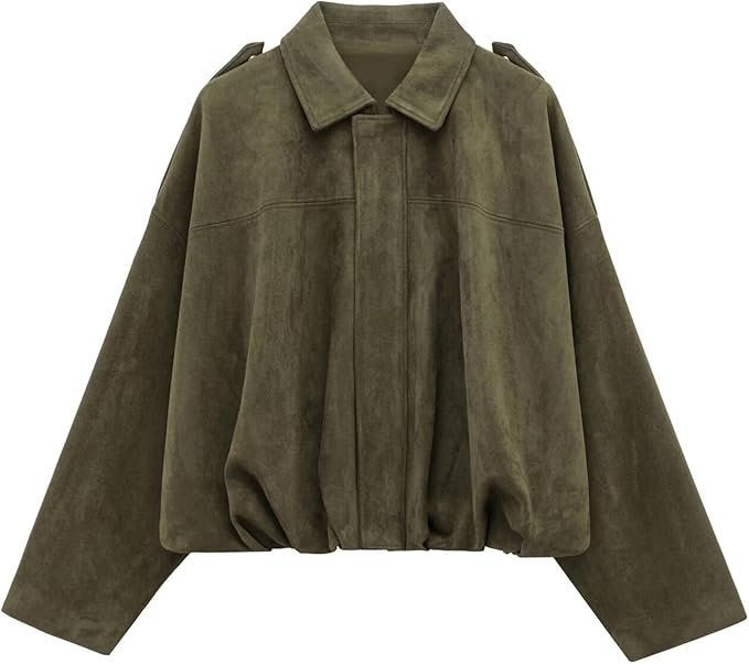 WOWULOVELY Women’s Faux Suede Bomber Jacket Lapel Pilot Pocket Coat Casual Oversized Long Dolman Sleeves Trendy Streetwear